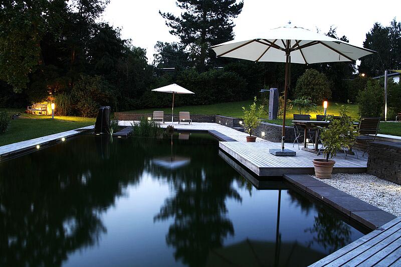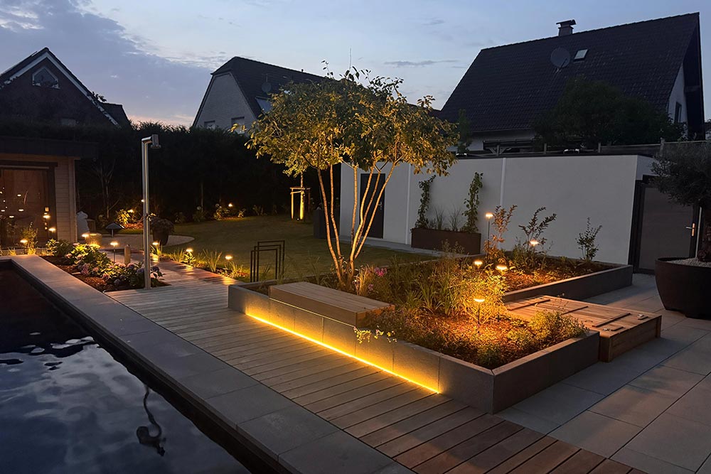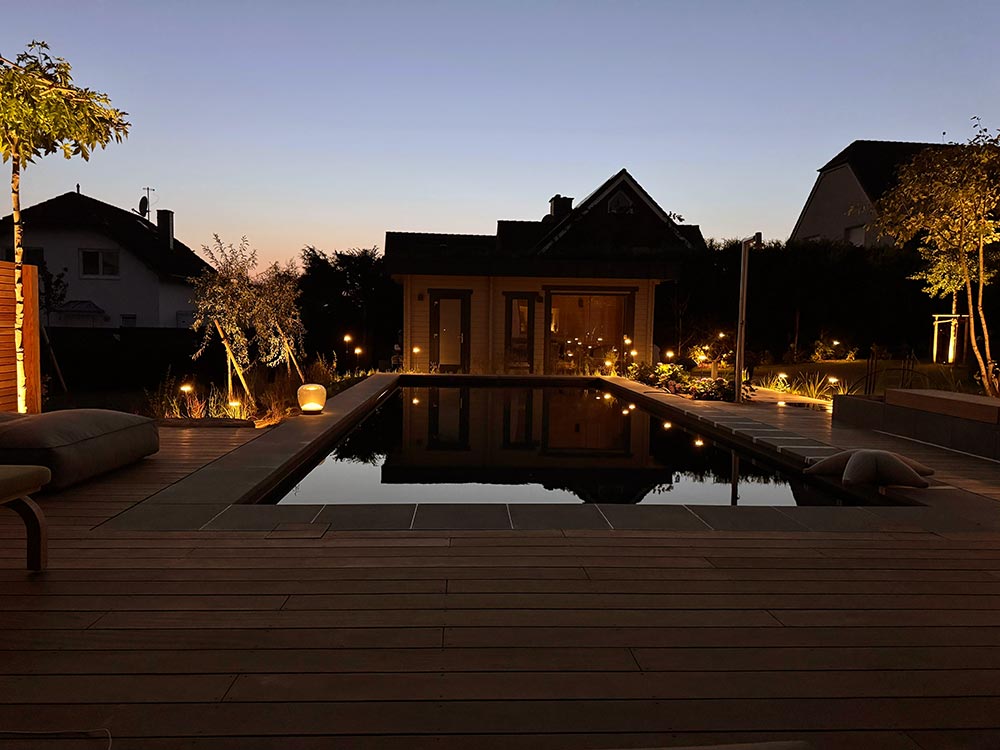 Der Garten am Abend kann ein völlig anderer sein als tagsüber. Durch geschickte Positionierung der Strahler entsteht Tiefe, wo vorher keine war, werden Details ausgeleuchtet, die tagsüber nicht zur Geltung kommen. Wir haben die Technik und das Know-how, um Ihren Garten, gerne auch zur Probe, auszuleuchten, und Sie können in Ruhe entscheiden, welche Art der Beleuchtung für Sie in Frage kommt.